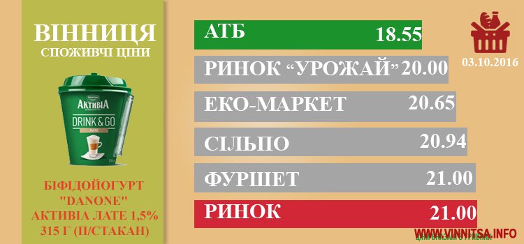 АТБ пр. Юності, 51, ЕКО-маркет пр. Юності, 18, Сільпо, вул. Келецька, 105, Фуршет, пр Хмельницьке шосе, 145-б, Ринок "Урожай", вул. Пірогова, 50 а, Ринок, вул. Некрасова, 48.