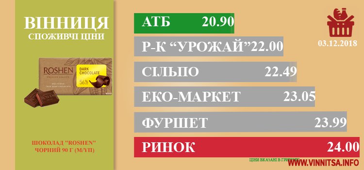 AТБ, пр. Юності, 51, ЕКО-маркет пр. Юності, 18, Сільпо, вул. Келецька, 105, Фуршет, вул. Е. Пікуса, 1-а , Ринок «Урожай», вул. Пирогова, 50 а, Ринок, вул. Некрасова, 4