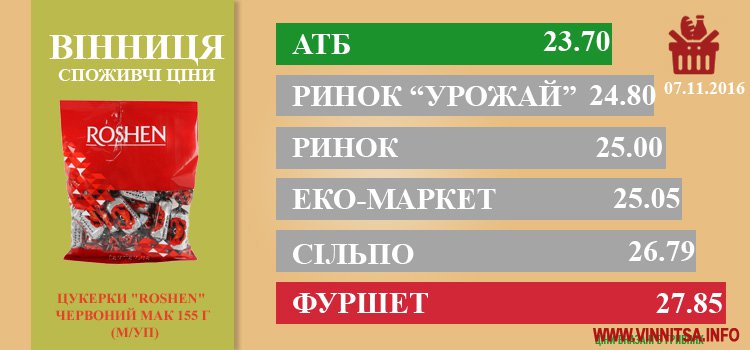 АТБ, пр. Юності, 51, ЕКО-маркет пр. Юності, 18, Сільпо, вул. Келецька, 105, Фуршет, Хмельницьке шосе, 145-б, Ринок «Урожай», вул. Пирогова, 50 а, Ринок, вул. Некрасова, 48.