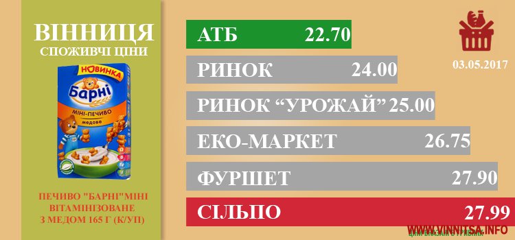 АТБ, пр. Юності, 51, ЕКО-маркет пр. Юності, 18, Сільпо, вул. Келецька, 105, Фуршет, Хмельницьке шосе, 145-б, Ринок «Урожай», вул. Пирогова, 50 а, Ринок, вул. Некрасова, 48.