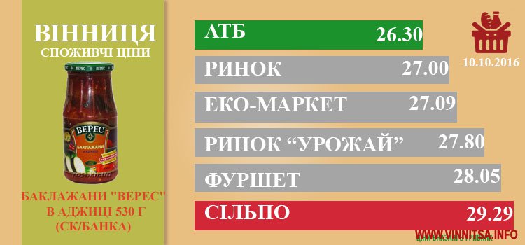 АТБ пр. Юності, 51, ЕКО-маркет пр. Юності, 18, Сільпо, вул. Келецька, 105, Фуршет, пр Хмельницьке шосе, 145-б, Ринок "Урожай", вул. Пірогова, 50 а, Ринок, вул. Некрасова, 48.