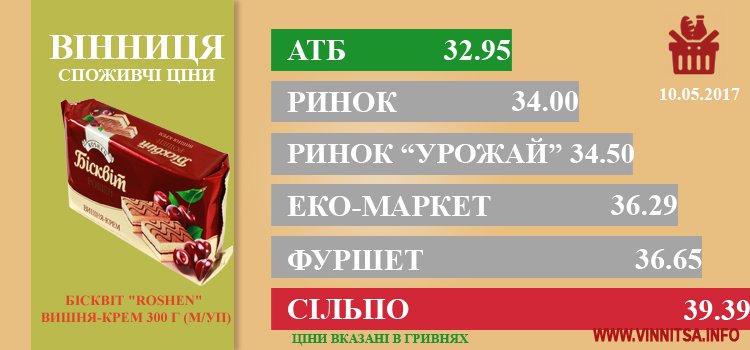 АТБ, пр. Юності, 51, ЕКО-маркет пр. Юності, 18, Сільпо, вул. Келецька, 105, Фуршет, Хмельницьке шосе, 145-б, Ринок «Урожай», вул. Пирогова, 50 а, Ринок, вул. Некрасова, 48.