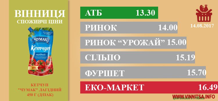 АТБ, пр. Юності, 51, ЕКО-маркет пр. Юності, 18, Сільпо, вул. Келецька, 105, Фуршет, Хмельницьке шосе, 145-б, Ринок «Урожай», вул. Пирогова, 50 а, Ринок, вул. Некрасова, 48.