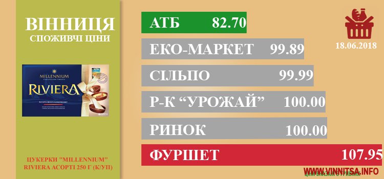 AТБ, пр. Юності, 51, ЕКО-маркет пр. Юності, 18, Сільпо, вул. Келецька, 105, Фуршет, вул. Е. Пікуса, 1-а , Ринок «Урожай», вул. Пирогова, 50 а, Ринок, вул. Некрасова, 4