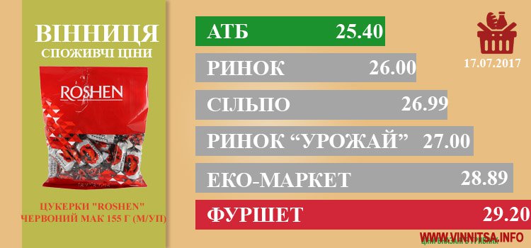АТБ, пр. Юності, 51, ЕКО-маркет пр. Юності, 18, Сільпо, вул. Келецька, 105, Фуршет, Хмельницьке шосе, 145-б, Ринок «Урожай», вул. Пирогова, 50 а, Ринок, вул. Некрасова, 48.