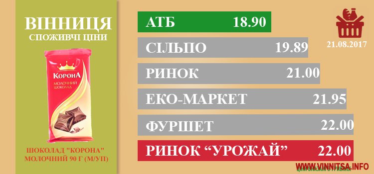 АТБ, пр. Юності, 51, ЕКО-маркет пр. Юності, 18, Сільпо, вул. Келецька, 105, Фуршет, Хмельницьке шосе, 145-б, Ринок «Урожай», вул. Пирогова, 50 а, Ринок, вул. Некрасова, 48.