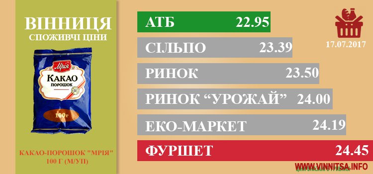АТБ, пр. Юності, 51, ЕКО-маркет пр. Юності, 18, Сільпо, вул. Келецька, 105, Фуршет, Хмельницьке шосе, 145-б, Ринок «Урожай», вул. Пирогова, 50 а, Ринок, вул. Некрасова, 48.