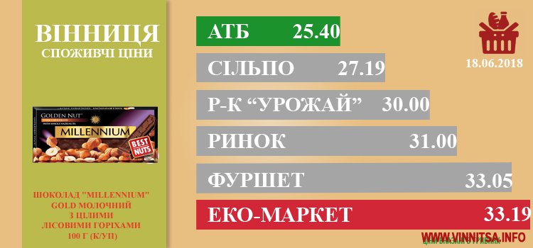 AТБ, пр. Юності, 51, ЕКО-маркет пр. Юності, 18, Сільпо, вул. Келецька, 105, Фуршет, вул. Е. Пікуса, 1-а , Ринок «Урожай», вул. Пирогова, 50 а, Ринок, вул. Некрасова, 4