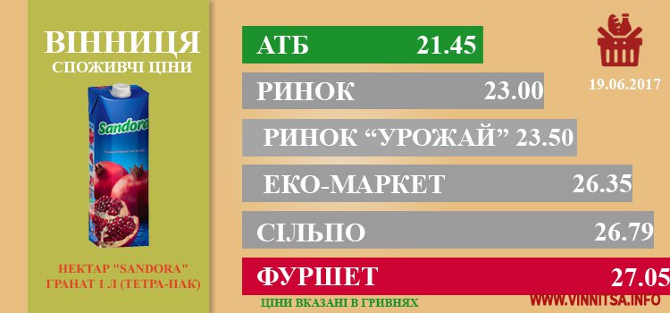 АТБ, пр. Юності, 51, ЕКО-маркет пр. Юності, 18, Сільпо, вул. Келецька, 105, Фуршет, Хмельницьке шосе, 145-б, Ринок «Урожай», вул. Пирогова, 50 а, Ринок, вул. Некрасова, 48.