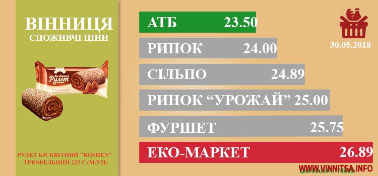 AТБ, пр. Юності, 51, ЕКО-маркет пр. Юності, 18, Сільпо, вул. Келецька, 105, Фуршет, вул. Е. Пікуса, 1-а , Ринок «Урожай», вул. Пирогова, 50 а, Ринок, вул. Некрасова, 48