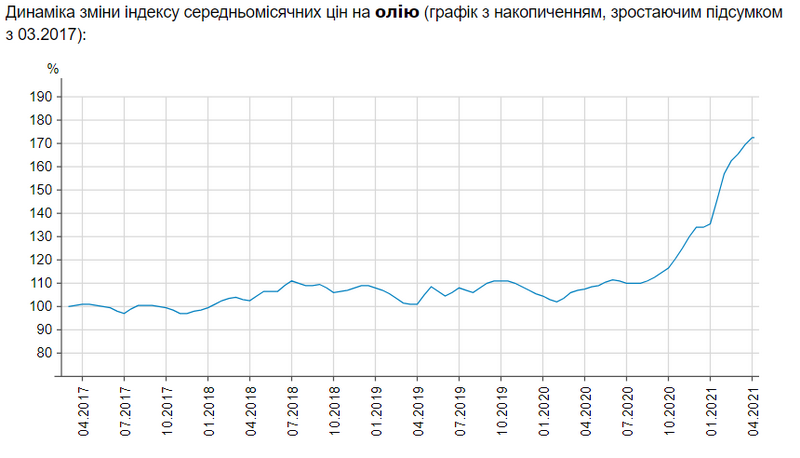 В квітні 2021 року ціни на олію соняшникову найвищі з 2017 року.
