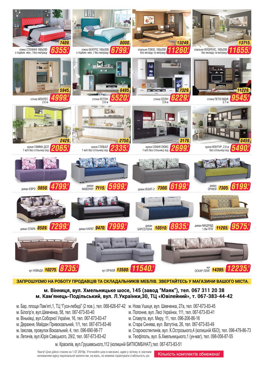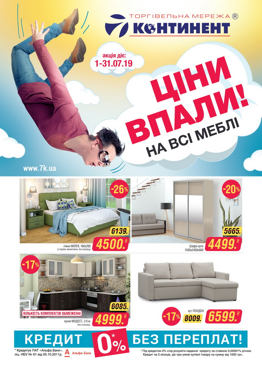 В липні торгівельна мережа «7 Континент» продовжує радувати покупців акційними пропозиціями та знижками. Так, ціни впали до 26 % від звичайної ціни на меблі: спальні, кухні, стінки, ліжка, дивани, шафи-купе. Всі меблі у різних стильових напрямах - від витонченої класики до меблів у стилі модерн. Знижка доступна до кінця липня. Поспішайте, адже саме зараз час купити стильні і якісні меблі та заощадити гроші на відпочинок.