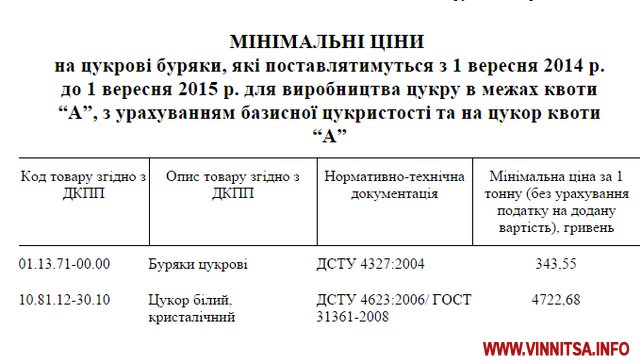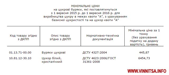 Якщо у період з 1 вересня 2014 року до 1 вересня 2015 року мінімальна ціна однієї тонни буряків (без ПДВ) становила 343 грн. 55 коп., а цукру – 4722 грн. 68 коп., то з 1 вересня 2015 року до 1 вересня 2016 року цифри збільшаться до 445 грн. 87 коп. та 6454 грн. 73 коп. відповідно.