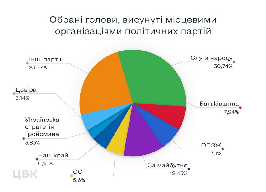 Із загальної кількості таких голів майже 30,74 % (225 осіб) представляють партію «Слуга народу». Слідом розмістилися наступні партії, кандидати від яких стали переможцями виборів сільського, селищного та міського голови: «За майбутнє» – понад 12,43 % (92 осіб), «Всеукраїнське обʼєднання «Батьківщина»» – понад 7,24 % (53 особи), «Опозиційна платформа – за життя» – понад 7,1% (52 особи), «Наш край» – майже 6,15 % (45 осіб), «Європейська солідарність» – понад 5,6% (41 особа), «Українська стратегія Гройсмана» – 3,83 % (28 осіб), «Довіра» – понад 3,14 % (23 особи). Інші партії за результатами виборів делегували на посади голів різних рівнів менше 20 осіб.