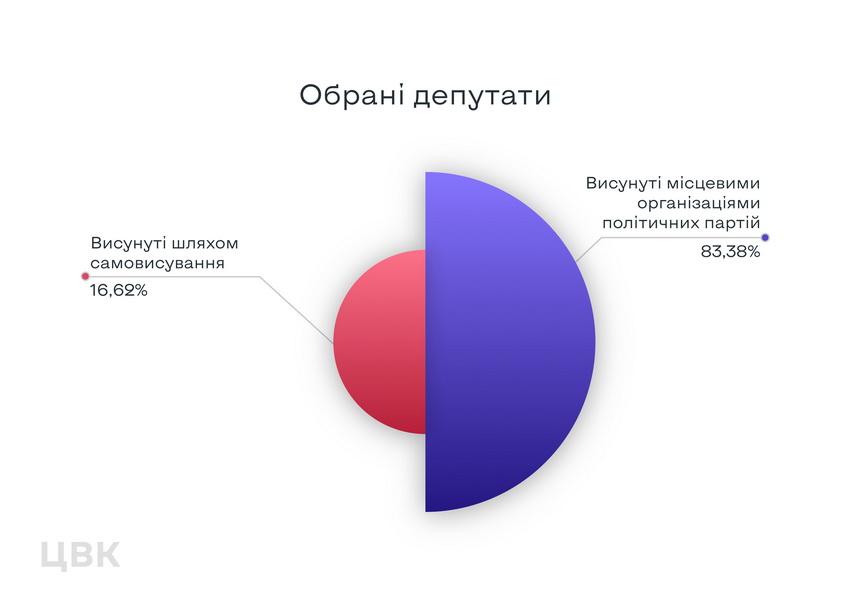 Як зазначають в комісії, аналіз отриманої на сьогодні інформації засвідчив, що 6 586 обраних депутатів висувалися для участі у виборах шляхом самовисування (у територіальних громадах з кількістю виборців до 10 тисяч). 33 029 обраних депутатів висувалися місцевими організаціями політичних партій. При цьому варто нагадати, що кандидати у депутати, які висувалися місцевими організаціями політичних партій, брали участь у виборах за двома виборчими системами. У територіальних громадах з кількістю виборців до 10 тисяч – за мажоритарною системою, у тергромадах з кількістю виборців 10 тисяч і більше – за системою пропорційного представництва за відкритими списками. Загалом своїх представників у місцевих радах різних рівнів отримали 110 політичних партій.