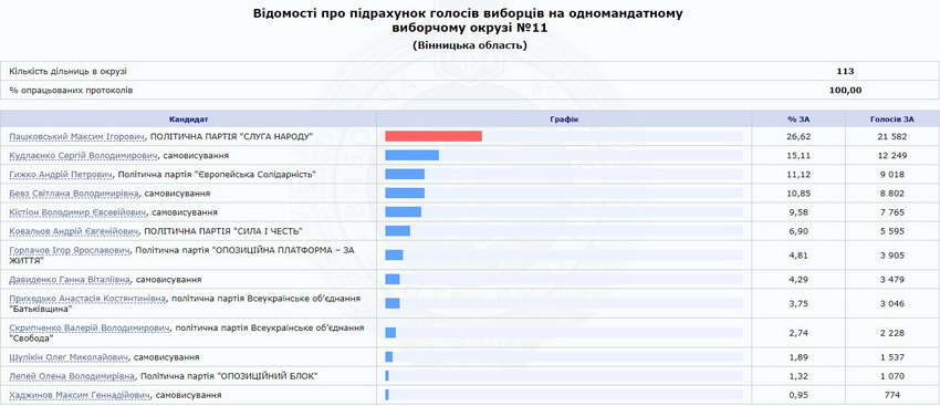 В окрузі №11 (частина міста Вінниці та Вінницького району) переміг Максим Пашковський із «Слуги народу» - 26,62% (21 582 голоси). На другому місці самовисуванець Сергій Кудлаєнко - 15,11%, на третьому – Андрій Гижко, представник партії «Європейська солідарність» - 11,12%.