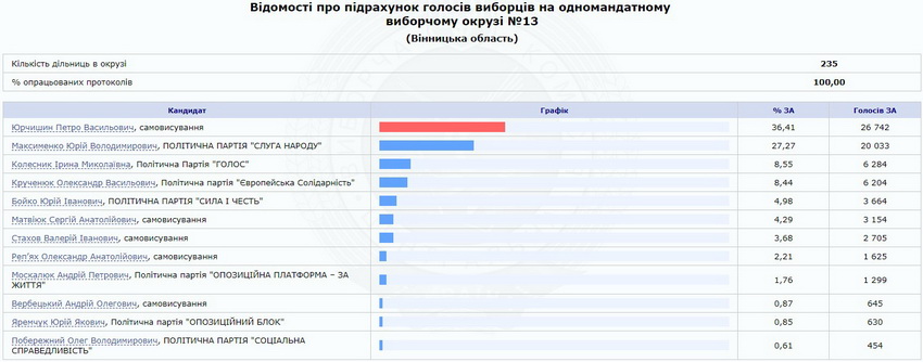 В окрузі №13 (Козятин, Хмільник, Калинівський, Козятинський, Хмільницький райони) переміг Петро Юрчишин. Від отримав 36,41% підтримки (проголосували 26 742 осіб). На другому місці із 27,27% представник «Слуги народу» Юрій Максименко. На третій позиції – кандидатка від політичної партії «Голос» Ірина Колесник - 8,55%.
