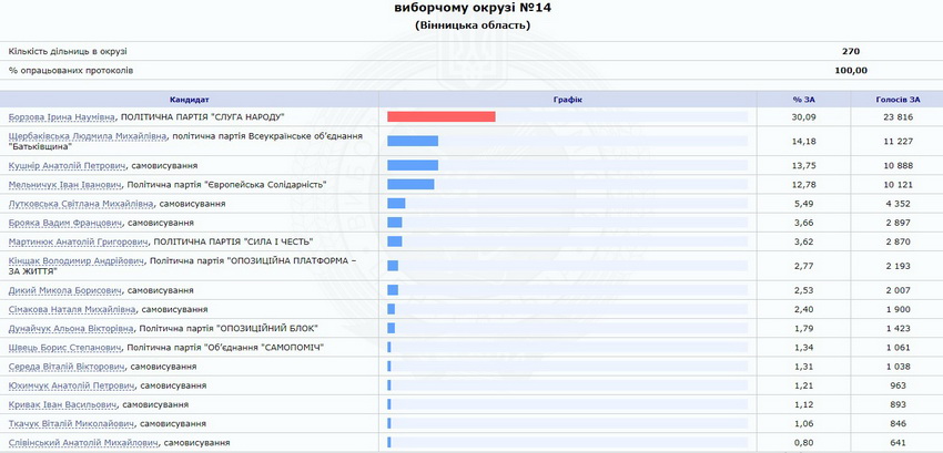 В окрузі №14 (Жмеринка, Барський, Жмеринський, Літинський, Тиврівський райони). Найбільше голосів набрала представниця політичної партії «Слуга народу» Ірина Борзова - 30,09% (23 816 осіб). На другому місці – кандидатка від ВО «Батьківщина» Людмила Щербаківська - 14,18%, слідом за нею – самовисуванець, колишній мер Жмеринки, Петро Кушнір - 13,75%.