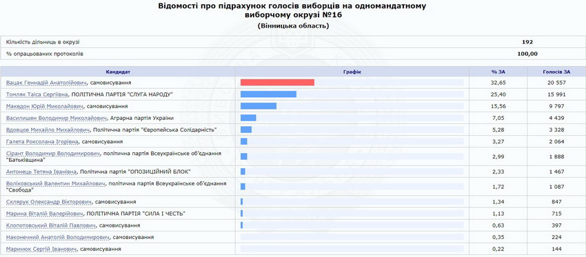 В окрузі №16 (місто Могилів-Подільський, Крижопільський, Могилів-Подільський, Піщанський, Чечельницький, Ямпільський райони) лідером виборчих перегонів став депутат Вінницької обласної ради, самовисуванець, Геннадій Вацак. Його підтримали 32,65% (20 557 осіб). На другому місці Таїса Томляк з політичної партії «Слуга народу» - 25,4%. Самовисуванець Юрій Македон на третьому місці - 15,56%.