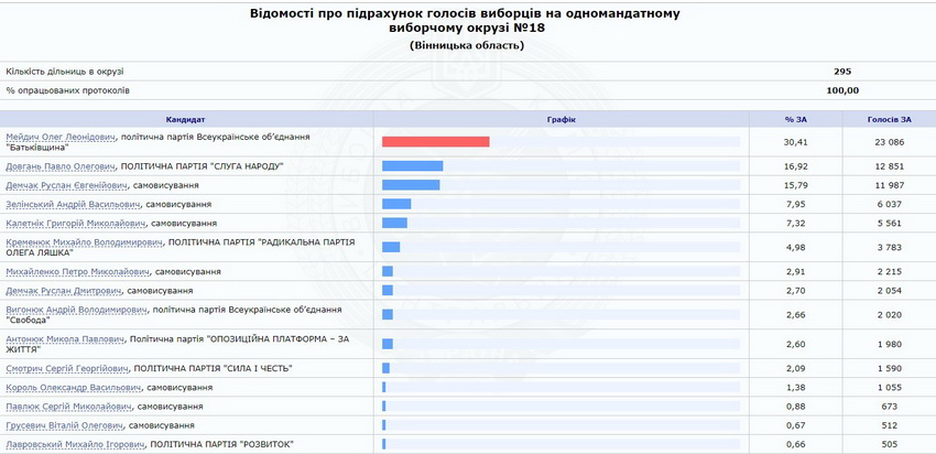 У мажоритарному окрузі №18 (Іллінецький, Липовецький, Немирівський, Оратівський, Погребищенський райони) переміг Олег Мейдич від ВО «Батьківщина». Його підтримали 30,41% (23 086 голосів). На другому місці Павло Довгань із «Слуги народу» - 16,92%, на третьому місці само висуванець Руслан Демчак - 15,79%.