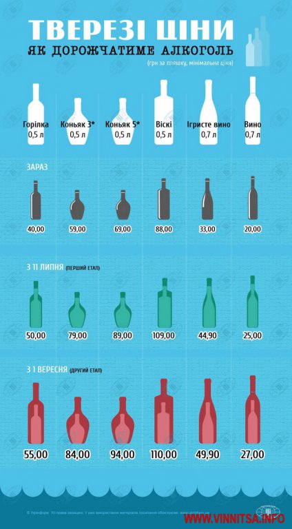 За Постановою № 116 Кабінету Міністрів України «Про внесення змін до постанови Кабінету Міністрів України від 30 жовтня 2008 р. № 957» від 17.06.2015 р. № 426 до 31 серпня 2015 року, а також з 1 вересня 2015 року, підвищується розмір мінімальних оптово-відпускних і роздрібних цін на окремі види алкогольних напоїв.
