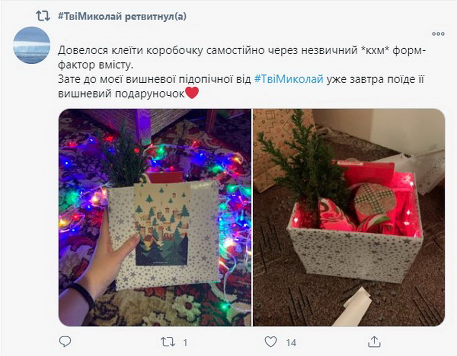 Вінничани активно долучаються до проекту #ТвіМиколай, який на просторах мережі «Twitter» діє уже восьмий рік. Це обмін подарунками між українськими користувачами мережі. «Твітеряни» заповнюють реєстраційну форму, вказують свій нікнейм, контактні дані, зокрема адресу Нової пошти. Обов’язковим полем під час реєстрації – залишити побажання своєму ТвіМиколаю. Потім організатори проводять жеребкування серед зареєстрованих учасників, рандомно обирають кожному підопічного. Так кожен учасник проекту отримує підопічного, якому надсилає подарунок до свята. За правилами, подарунок потрібно надіслати так, щоб він до 19 грудня уже встиг дійти до адресата.