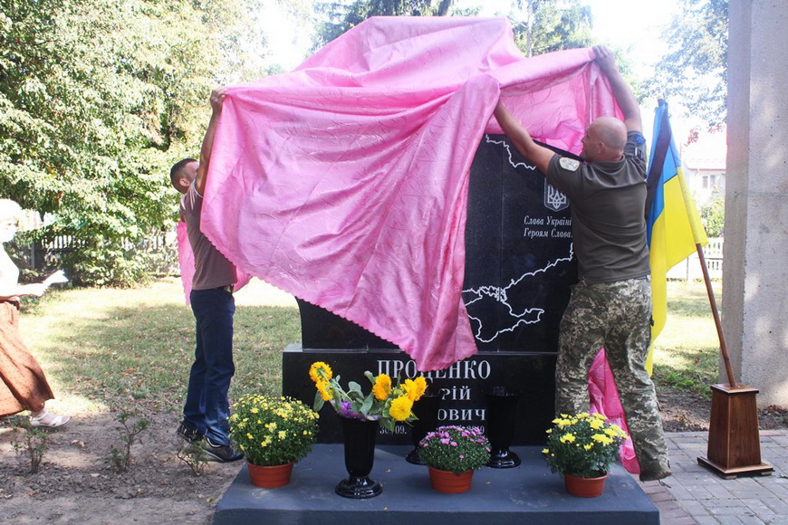 Присутні вшанували хвилиною мовчання пам'ять земляка – загиблого в атитерористичній операції – Андрія Проценка. Церемонію освячення пам’ятного знаку відслужив місцевий священник.