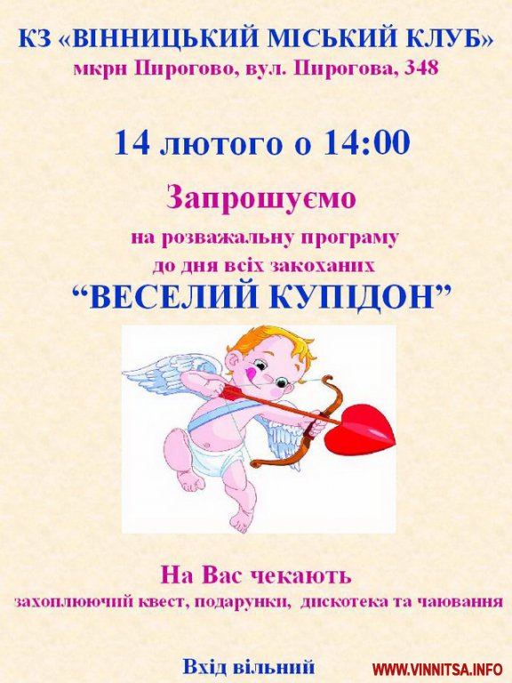 КЗ «Вінницький міський клуб» (вул. Пирогова,348) запрошує всіх бажаючих прийняти участь у захоплюючій розважальній програмі-квесті «Веселий Купідон», що відбудеться у мікрорайоні Пирогово 14 лютого о 14.00 год.Вхід – вільний.