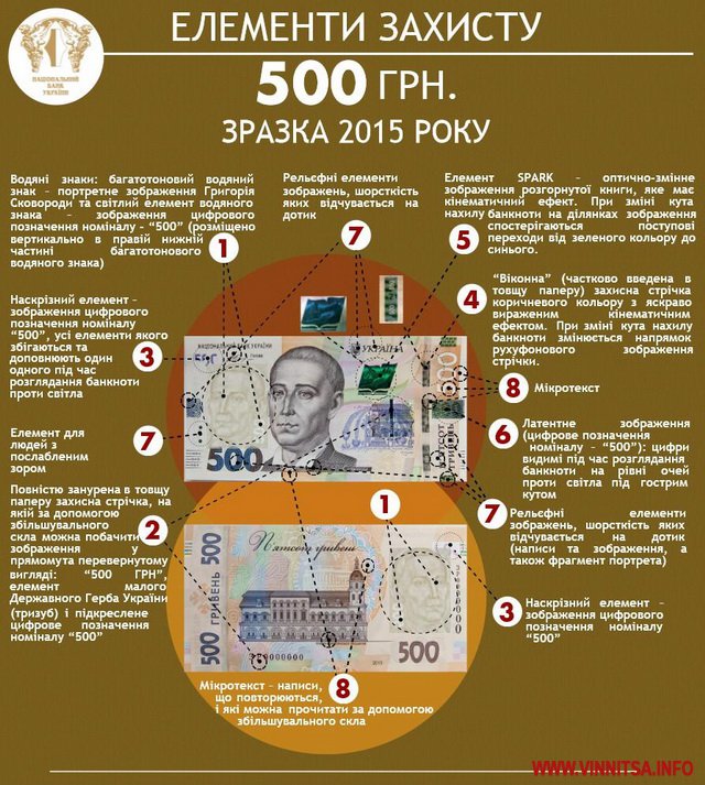 11 квітня 2016 року Національний банк України вводить в обіг оновлену банкноту номіналом 500 гривень зразка 2015 року з удосконаленою системою захисту.