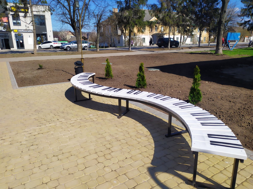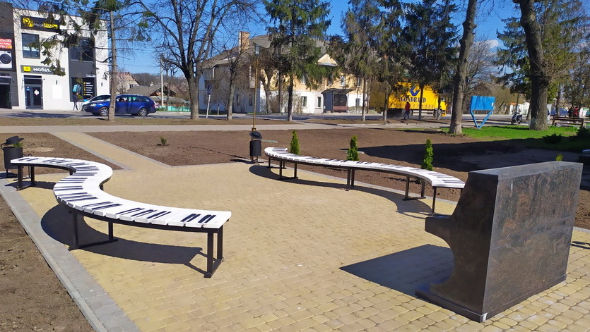 У містечку Гнівань, що неподалік Вінниці, встановили дві просторі лавочки у формі клавіш. Біля них висадили десяток молодих туй. Тут продовжують облаштовувати зону відпочинку неподалік місцевої музичної школи для дітей.