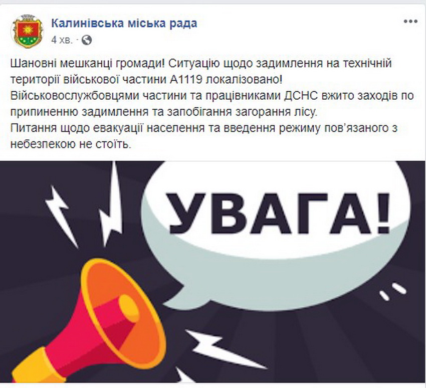 Калинівка міська рада повідомляє про локалізацію пожежі: «Шановні мешканці громади! Ситуацію щодо задимлення на технічній території військової частини А1119 локалізовано!