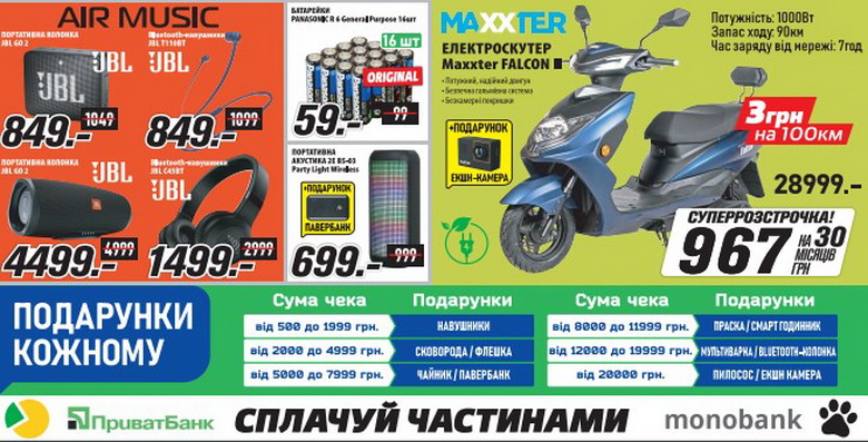 Магазин сучасної техніки підготував багато подарунків. Їх вручатимуть після оплати товару на касі. Серед презентів – навушники, сковорідка, флешка, чайник, павербанк, праска, смарт-годинник, мультиварка, портативна колонка, пилосос, екшн-камера.