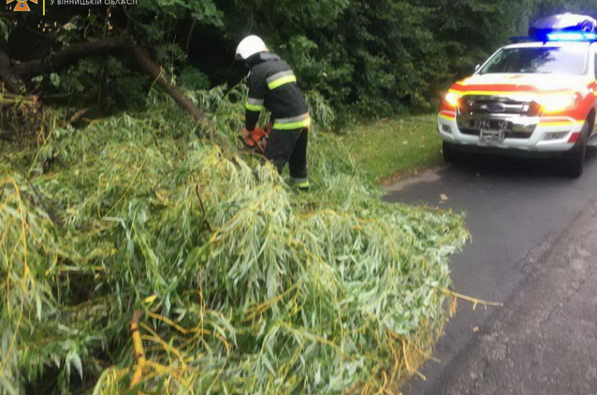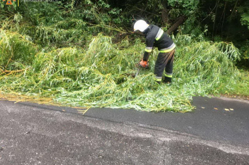 «У цей же день випадки падіння дерев були зафіксовані у Вінницькому, Хмільницькому, Гайсинському та Могилів-Подільському районах області. Розкряжувавши стовбури дерев, бійці ДСНС відновили рух автотранспорту на автошляхах. До проведення даних робіт від ДСНС залучалося 28 чоловік особового складу та сім спецавтомобілів», - повідомляє пресслужба.