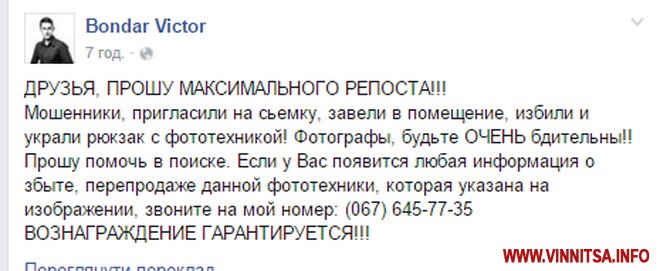 Наразі триває слідство. А Віктор Бондар закликає всіх колег бути обережними. Якщо хтось побачить його техніку в інтернет-магазинах чи ломбардах, звертатися до правоохоронців або на його телефон (067) 645 77 35.