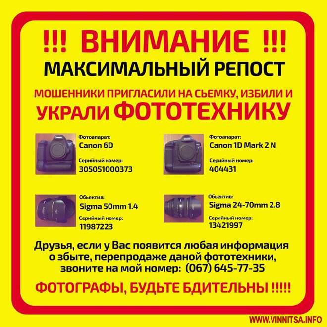У викраденій сумці знаходилися 2 фотоапарата, 3 об’єктива і 2 спалахи. Загальна вартість техніки – близько 3 тисяч доларів.