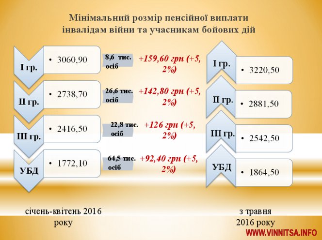 «159 гривень - це інваліди війни І групи. В учасників бойових дій таке підвищення склало 92 гривні. Такі ж підвищення отримали й інваліди, які постраждали внаслідок Чорнобильської катастрофи», - додала О.Корчака.