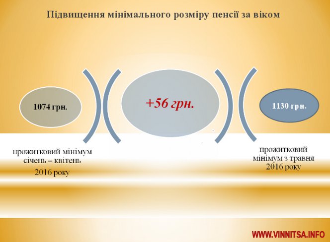 З 1 травня в Україні зріс розмір прожиткового мінімуму. Це стало підставою для перерахунку пенсій та соціальних виплат. Так, в середньому, пенсія у 390 тисяч вінничан збільшилася на 56 гривень.