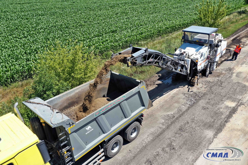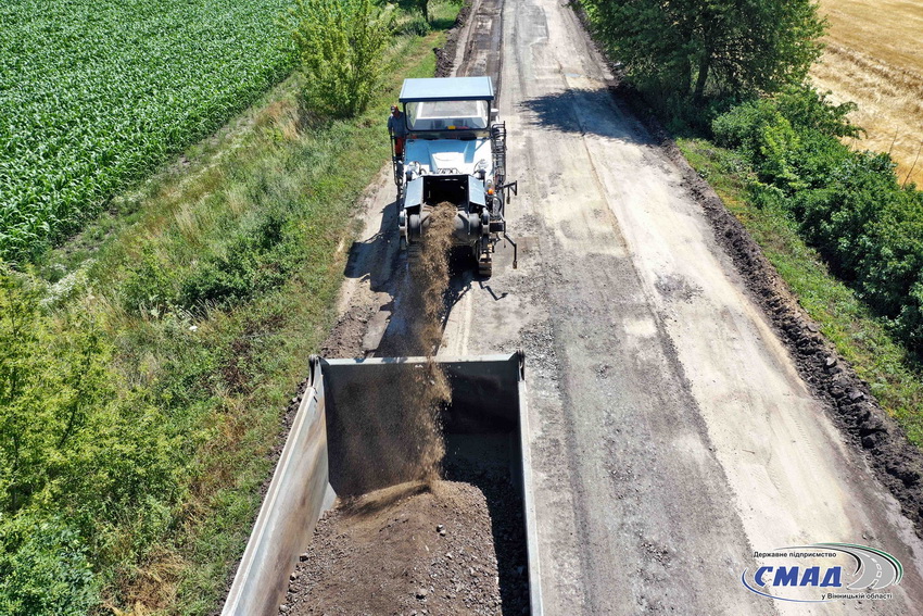 «Працівники підрядної організації приступили до виконання поточного середнього ремонту автомобільної дороги загального користування місцевого значення О-02-08-06 Білопілля-Вівсяники км 48+645 – км 59+623, протяжністю 10,978 км (с. Самгородок – с. Вівсяники, Козятинський район) у Вінницькій області в рамках президентської програми «Велике будівництво».