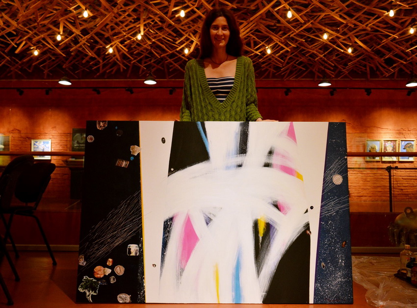Марина Наумчук на тлі своєї роботи у галереї ЛНАМ