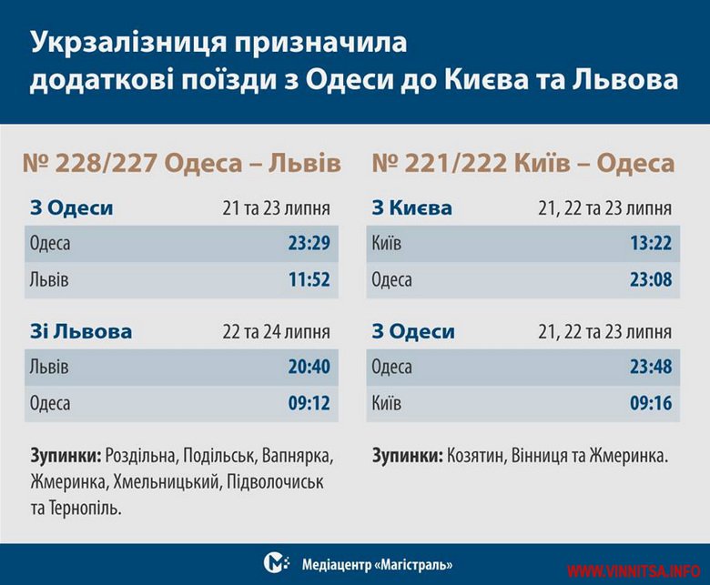 З вирушaє Києвa – 21, 22, 23 липня. Київ – 13:22. Одесa – 23:08.