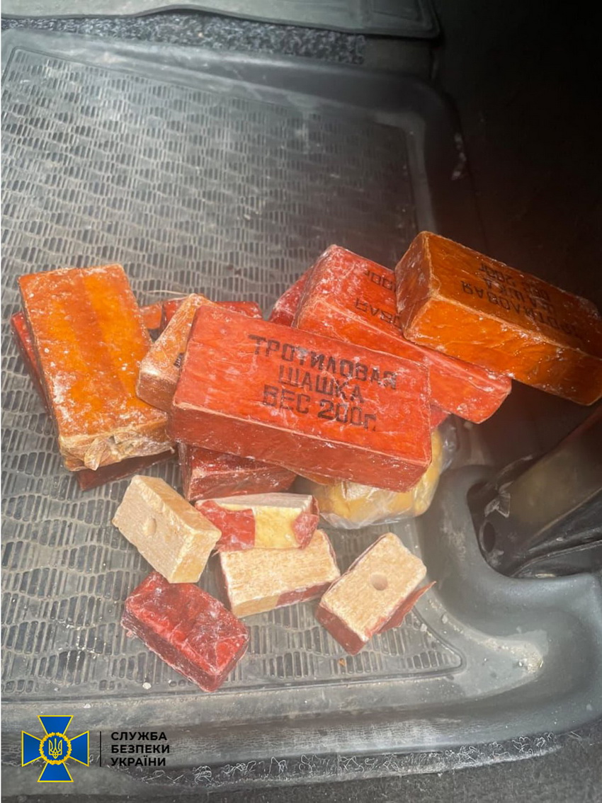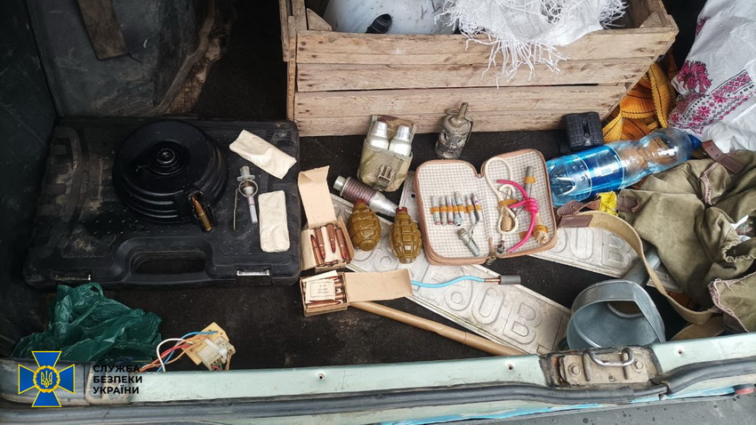 У речовому мішку радянського зразку знаходилось близько 2 кг тротилу та пластиду, 10 гранат РГД та Ф1, запали до них, набої та барабан до автоматичної стрілецької зброї, гранати для підствольного гранатомету, газова граната Терен-7.