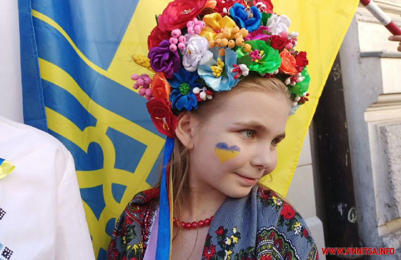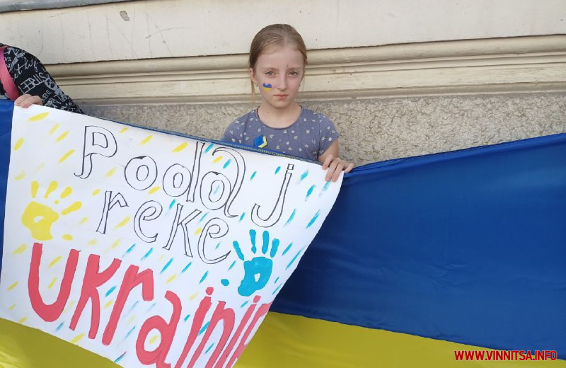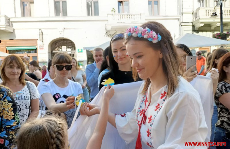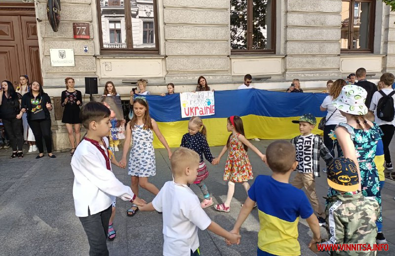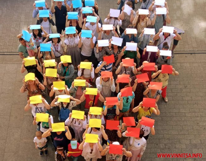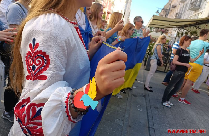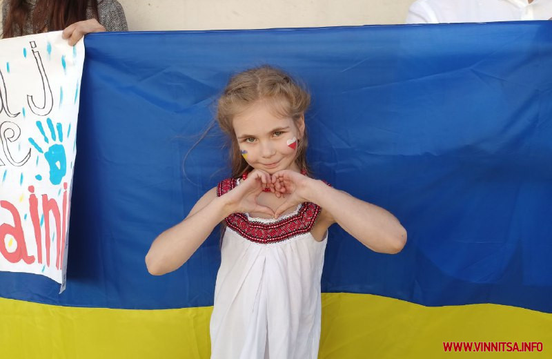 Дорослі прийшли разом з дітьми, які охоче допомагали роздавати перехожим синьо-жовті голуби миру і символічні патріотичні значки.