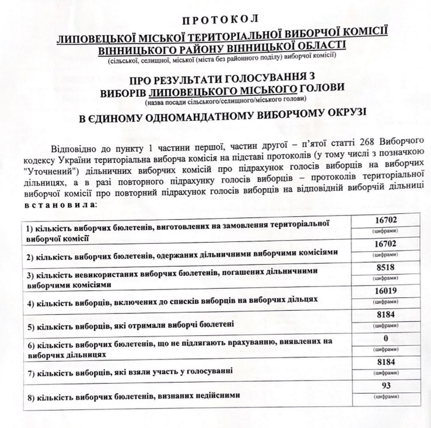 Загалом, у виборах Липовецького міського голови взяли участь 8184 виборців. Недійсними визнано 93 бюлетені.