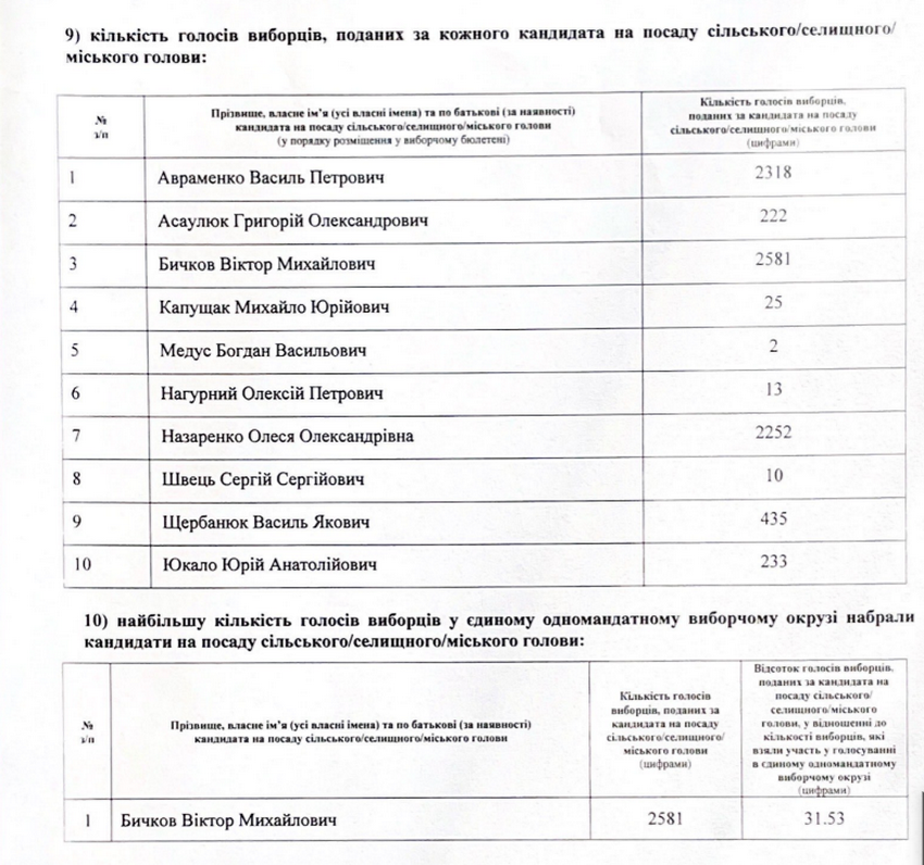За Авраменка Василя Петровича (ЄС) проголосували 2318 виборців. За Назаренко Олесю Олександрівну (Українська стратегія Гройсмана) – 2252 виборців. За Щербанюка Василя Яковича (За Майбутнє) – 435. Юкало Юрій Анатолійович (СН) набрав 233 голосів. Асаулюк Григорій Олександрович (самовисуванець) набрав 222 голосів. Капущак Михайло Юрійович (самовисуванець) – 25. Нагурний Олексій Петрович (самовисуванець) – 13. Швець Сергій Сергійович (самовисуванець) – 10. Медус Богдан Васильович (самовисуванець) – 2.