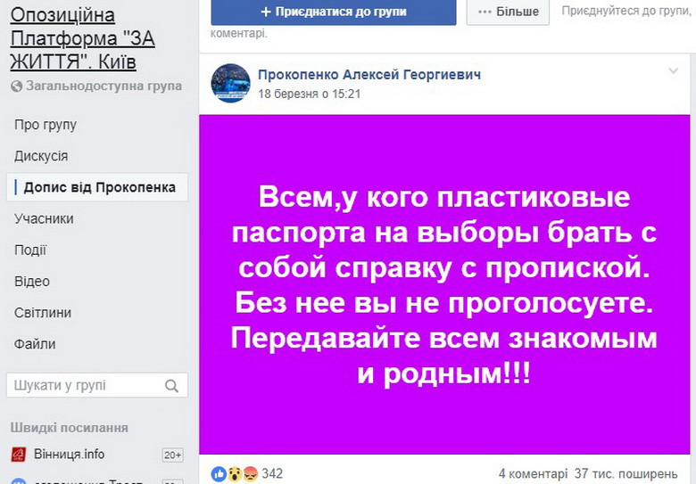 У мережі «Фейсбук» з сторінки «Опозиційної платформи «За життя» поширюють фейк, що громадяни, які мають ID-паспорти не зможуть проголосувати у день виборів, що їм потрібно брати із собою документ із пропискою. За 10 днів, з 18 до 29 березня дописом поділились 37 тисяч користувачів. Дана інформація безпідставна.