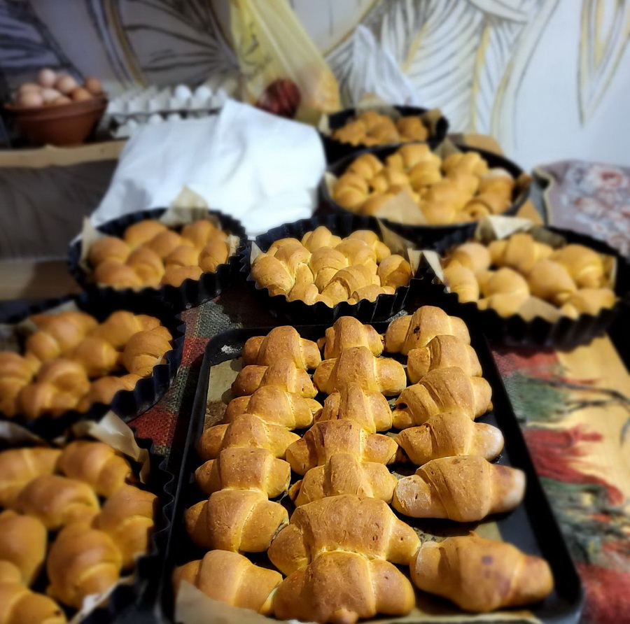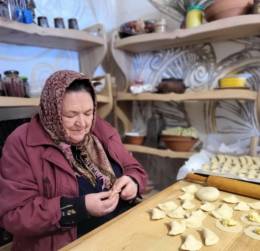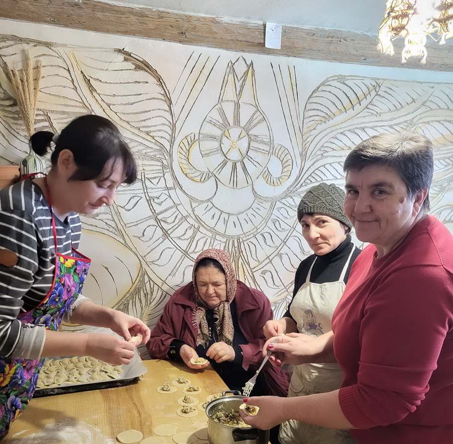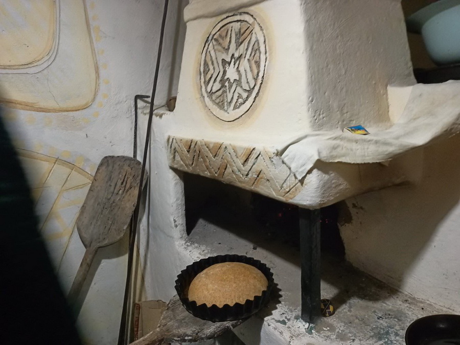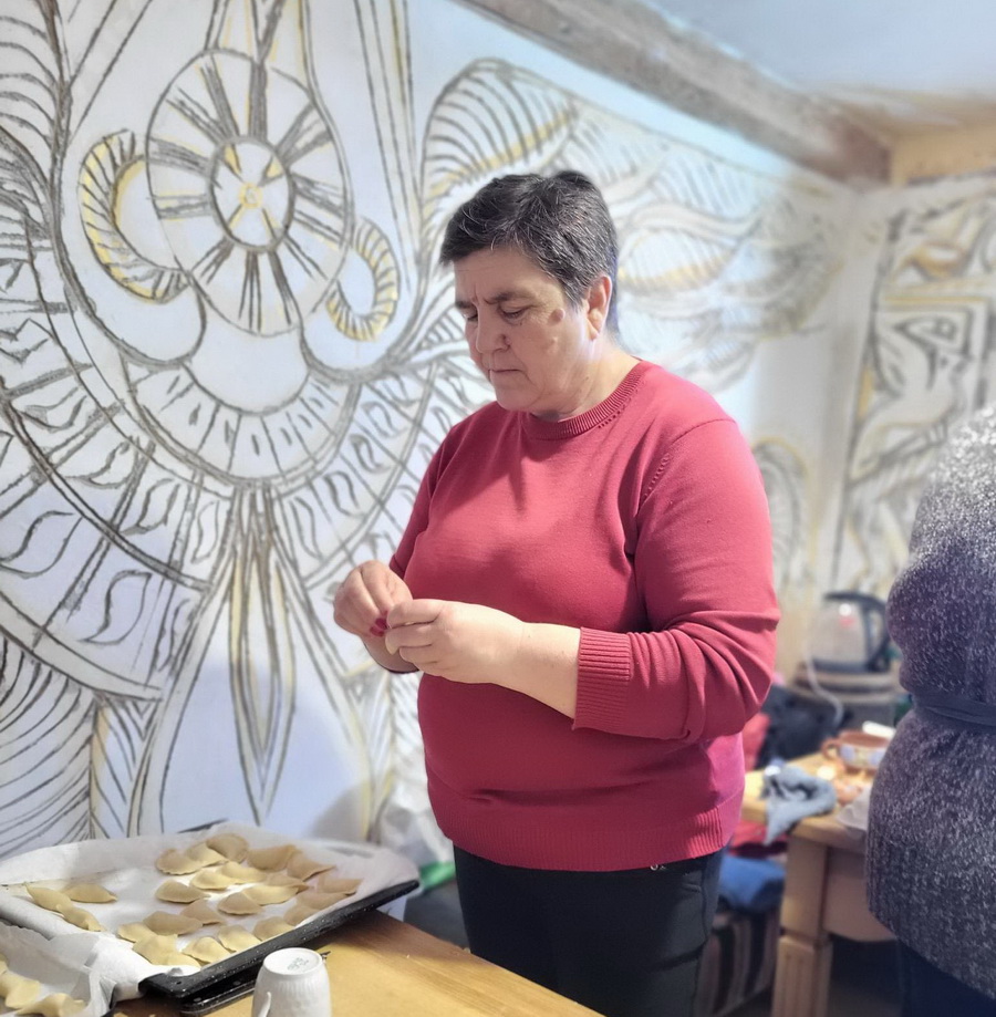 Продукти для страв приносять з власного городу жителі нашої громади, допомагають і небайдужі. В нас біля музею ткацтва, є цікаве приміщення, тут колись жила бабуся. Залишилась кухні і є древня піч, якій більше 100 років. І ми вирішили готувати в ній страви для воїнів. Спершу спекли хліб. Він вийшов дуже смачний. А зараз все готуємо в цій печі. І ось будемо готувати налисники із картоплею та грибами, з м’ясом, з капустою квашеною.