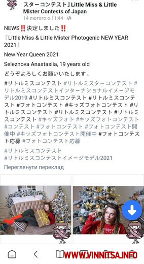 19-річна Анастасія Селезньова з Вінниці перемогла у японському конкурсі краси «Новорічна королева 2021», який організували «Little Miss & Little Mister Contests of Japan». У ньому взяли участь сотні дівчат з різних країн світу. У категорії «дівчата віком від 18 до 25 років» першість отримала саме наша землячка. Після завершення паднемії дівчина планує приїхати до Японії на запрошення організаторів, тому активно вивчає японську мову.