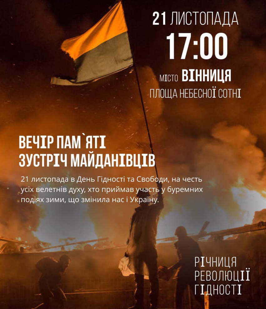 21 листопада відзначають День Гідності та Свободи. У четвер вінничан запрошують прийти на площу Небесної сотні, де відбудеться зустріч майданівців.