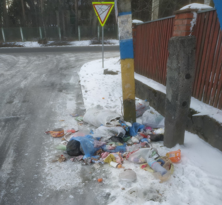 У Гніванській територіальній громаді встановлюють осіб, які 2 лютого закидали сміттям вулицю Щасливу у селі Селище. Прямо перед перехрестям, під електроопору розфарбовану національною символікою, невідомі полишили кілька пакетів із відходами.