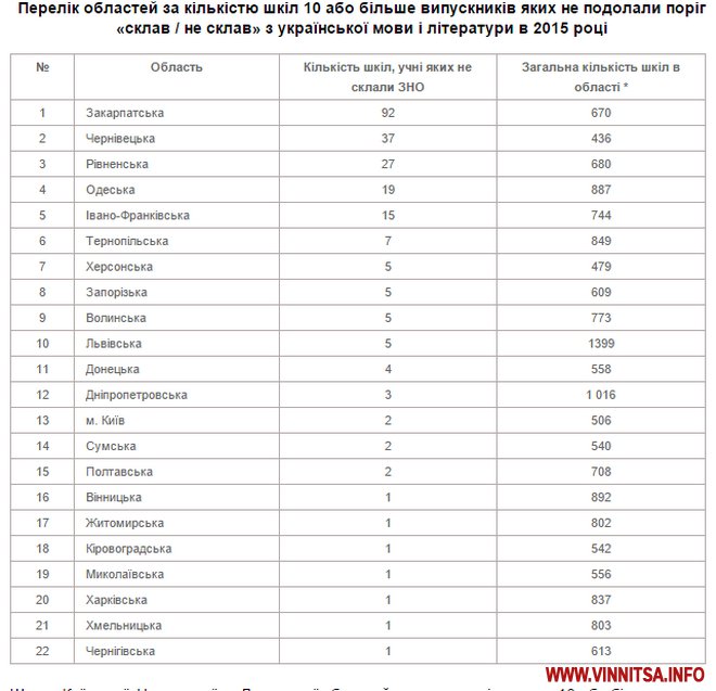 Український центр оцінювання якості освіти оприлюднив список українських шкіл, у яких десять або більше випускників не подолали поріг «склав/не склав» при складанні тесту зовнішнього незалежного оцінювання з української мови і літератури в 2015 році. На щастя, Вінниччина у переліку «пасе задніх».